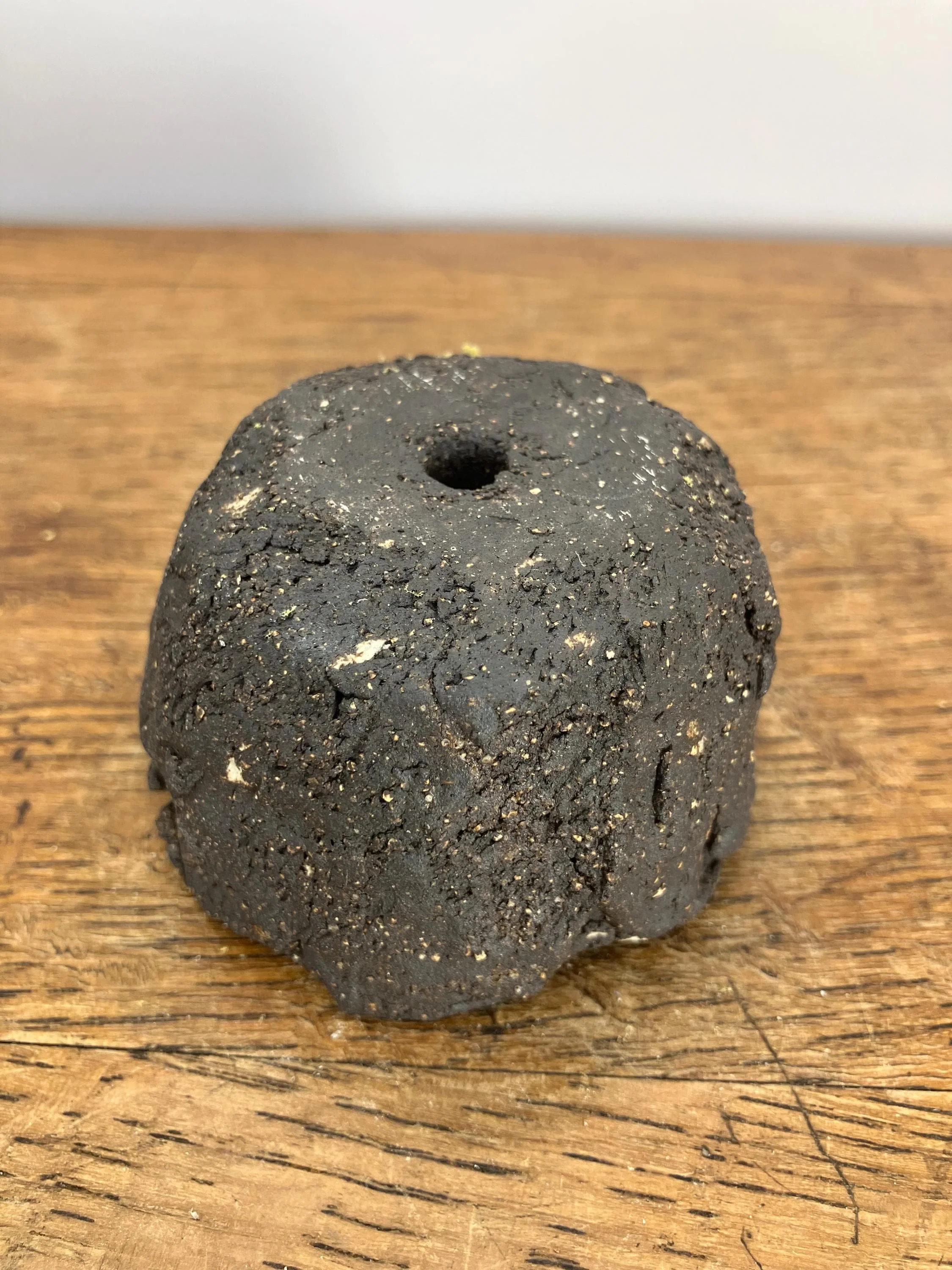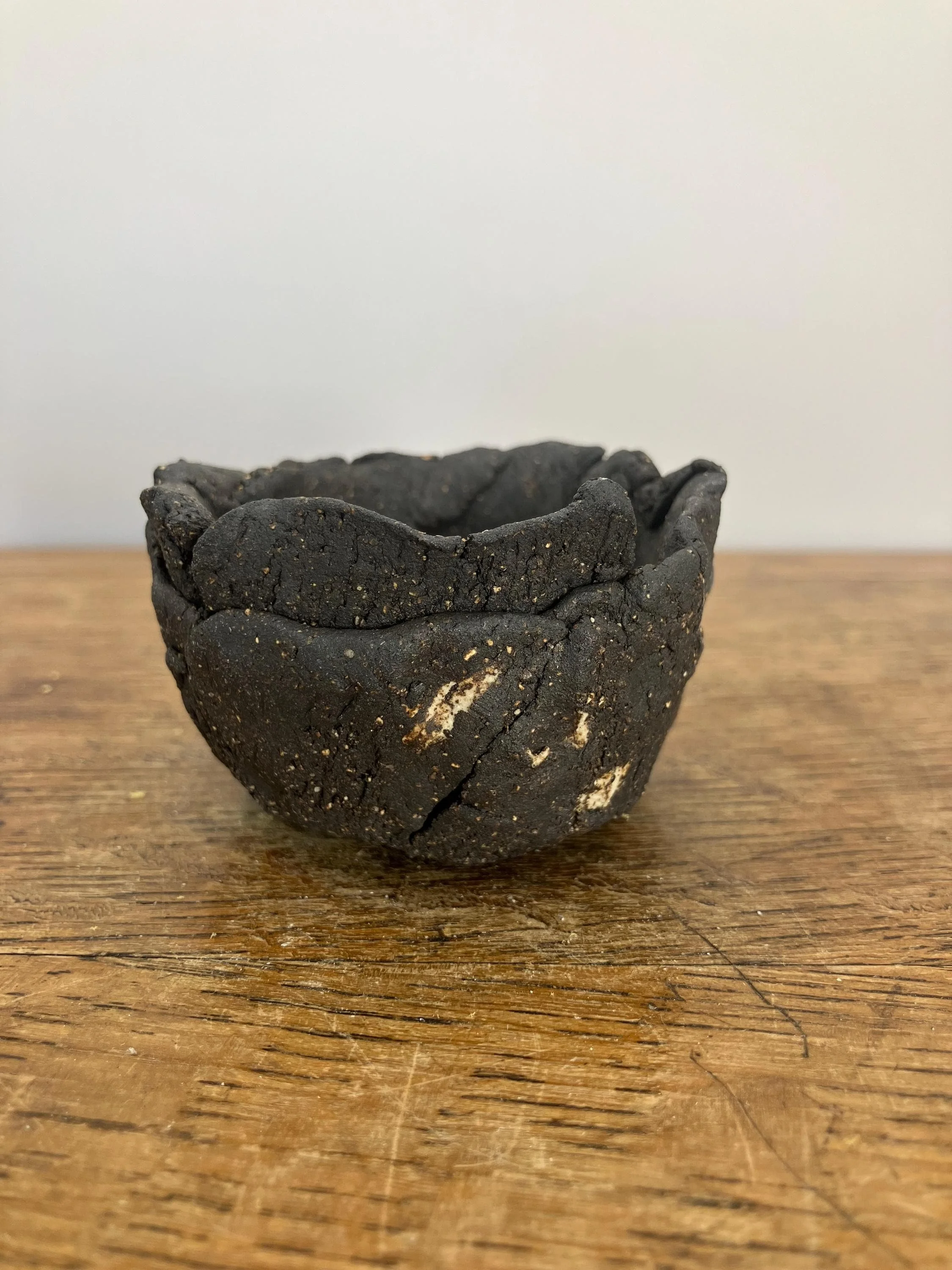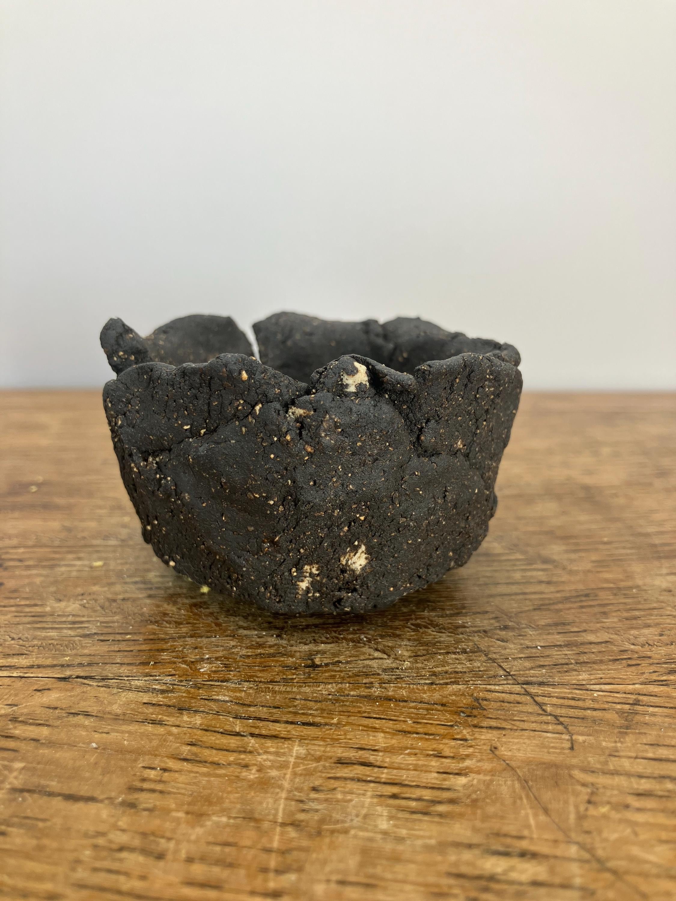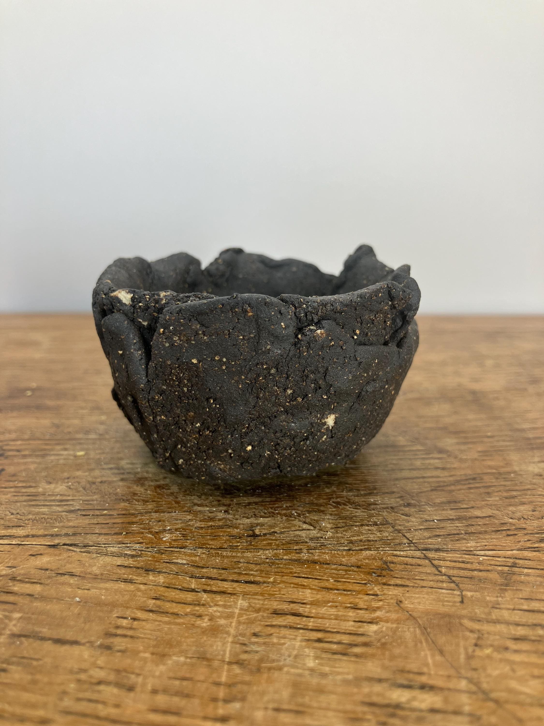 This primitive-style planter is hand-formed from black stoneware clay with some small pieces of white clay also embedded with River Dart sand, unglazed creating a unique textured surface that reflects the raw beauty of nature. The rustic, organic design makes it the perfect vessel for displaying your favorite cacti, succulents, or small plants, adding a touch of natural elegance to your home or garden.